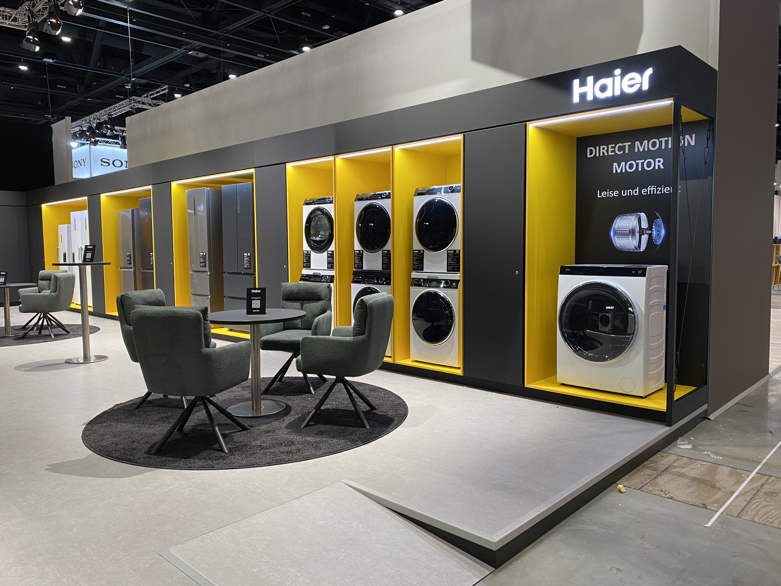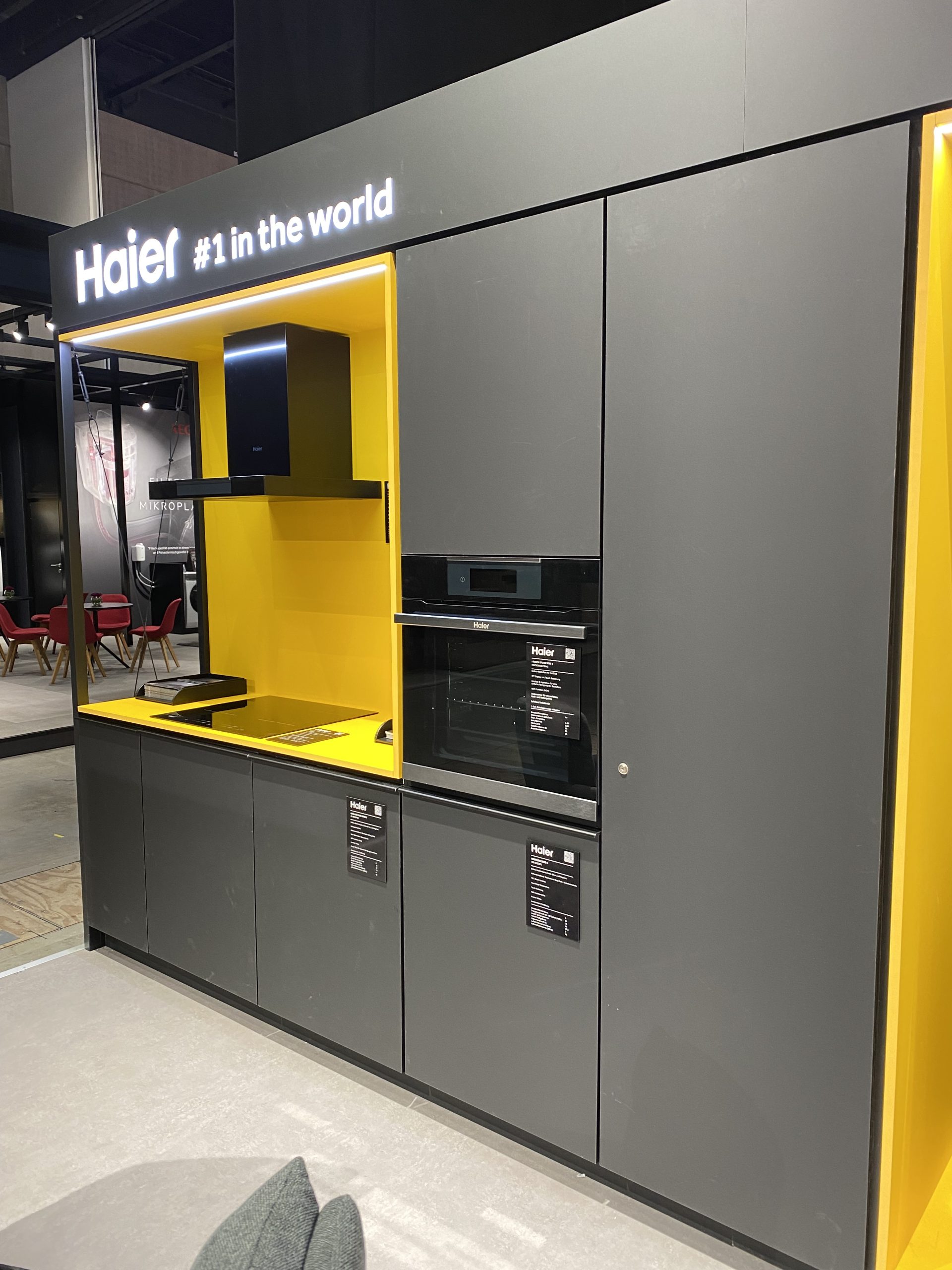 Edles Anthrazit verleiht dem Stand eine ruhige, hochwertige Ausstrahlung, während das kraftvolle Haier-Gelb gezielt Akzente setzt und für visuelle Spannung sorgt.