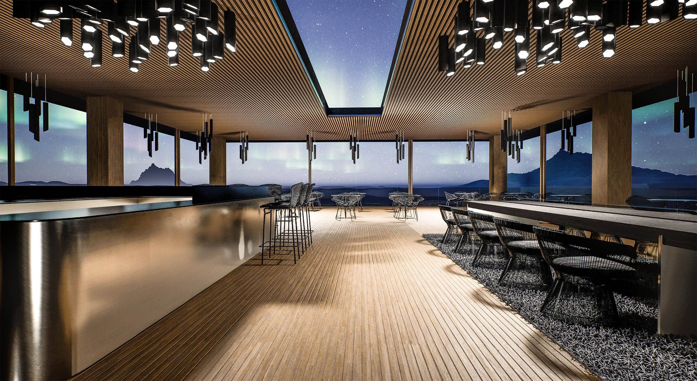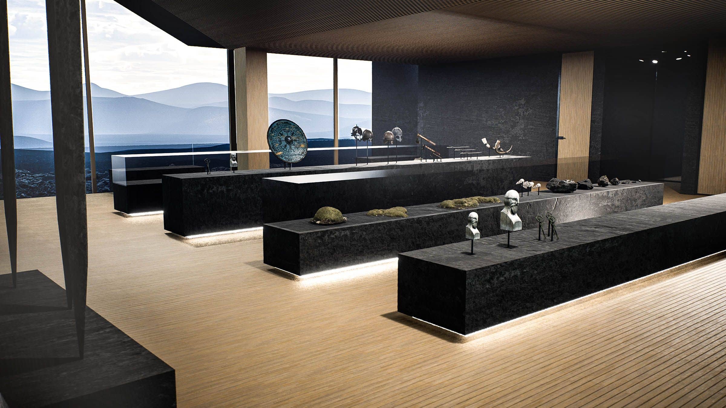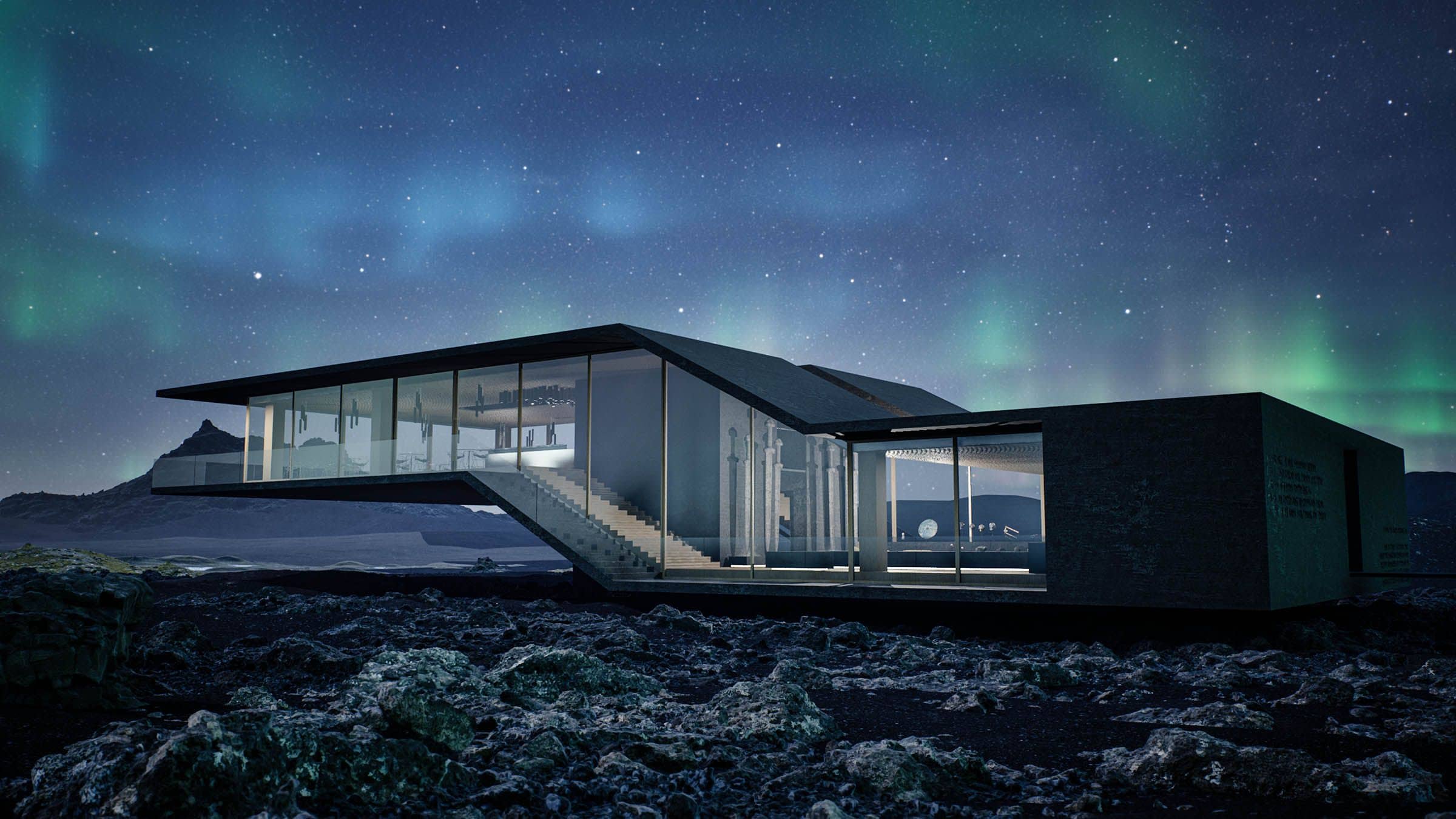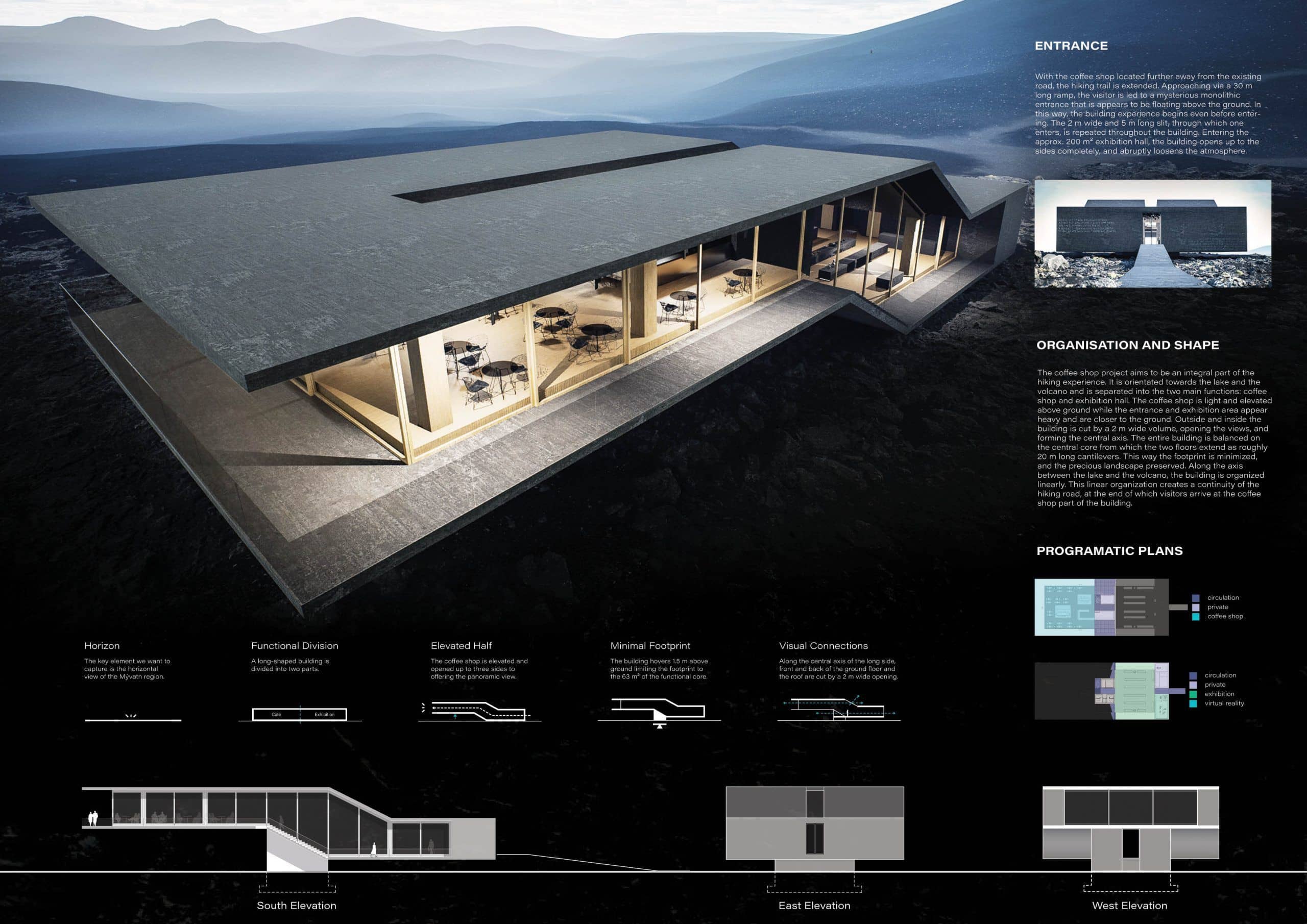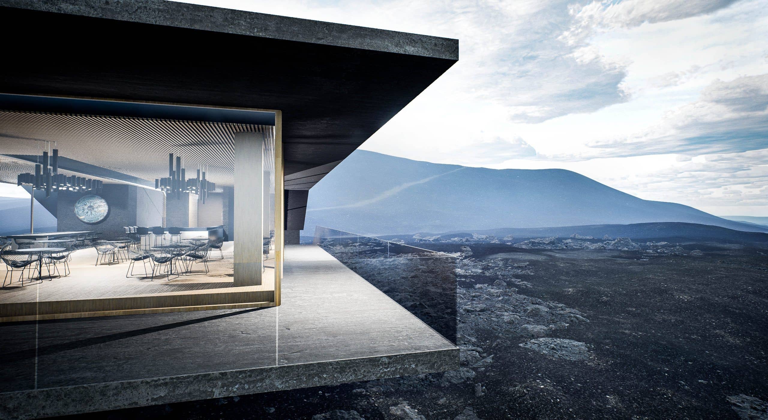 Unser Konzept greift die rohe Kraft der Umgebung auf: das Lavagestein, die Weite, die Stille. Die Struktur scheint über dem Gelände zu schweben, getragen von Betonstützen, die wie aus der Erde gewachsen wirken. Großflächige Glasfronten öffnen den Blick auf die Landschaft und schaffen eine Verbindung zwischen Innenraum und Natur – zwischen Mythos und Gegenwart.