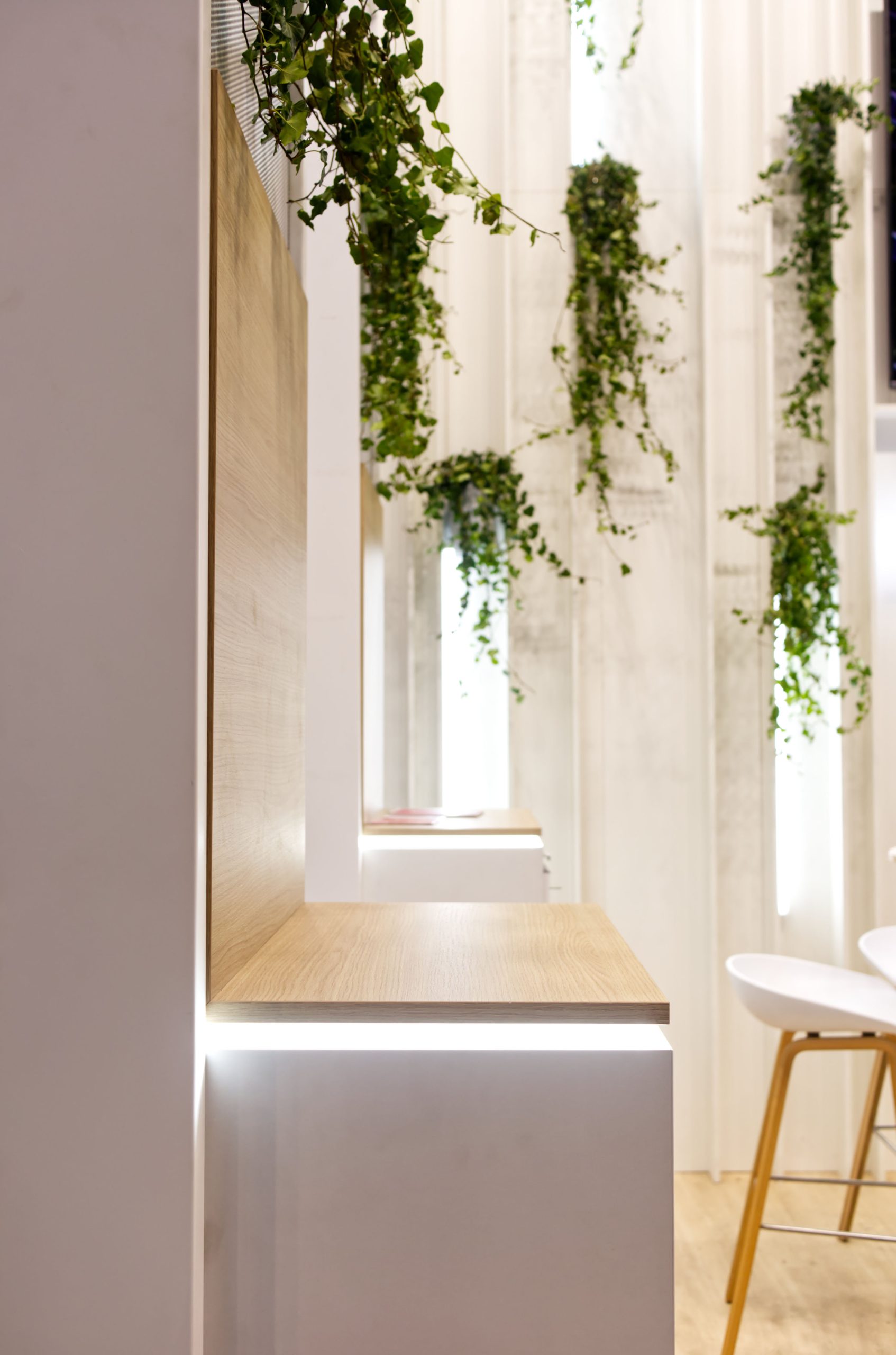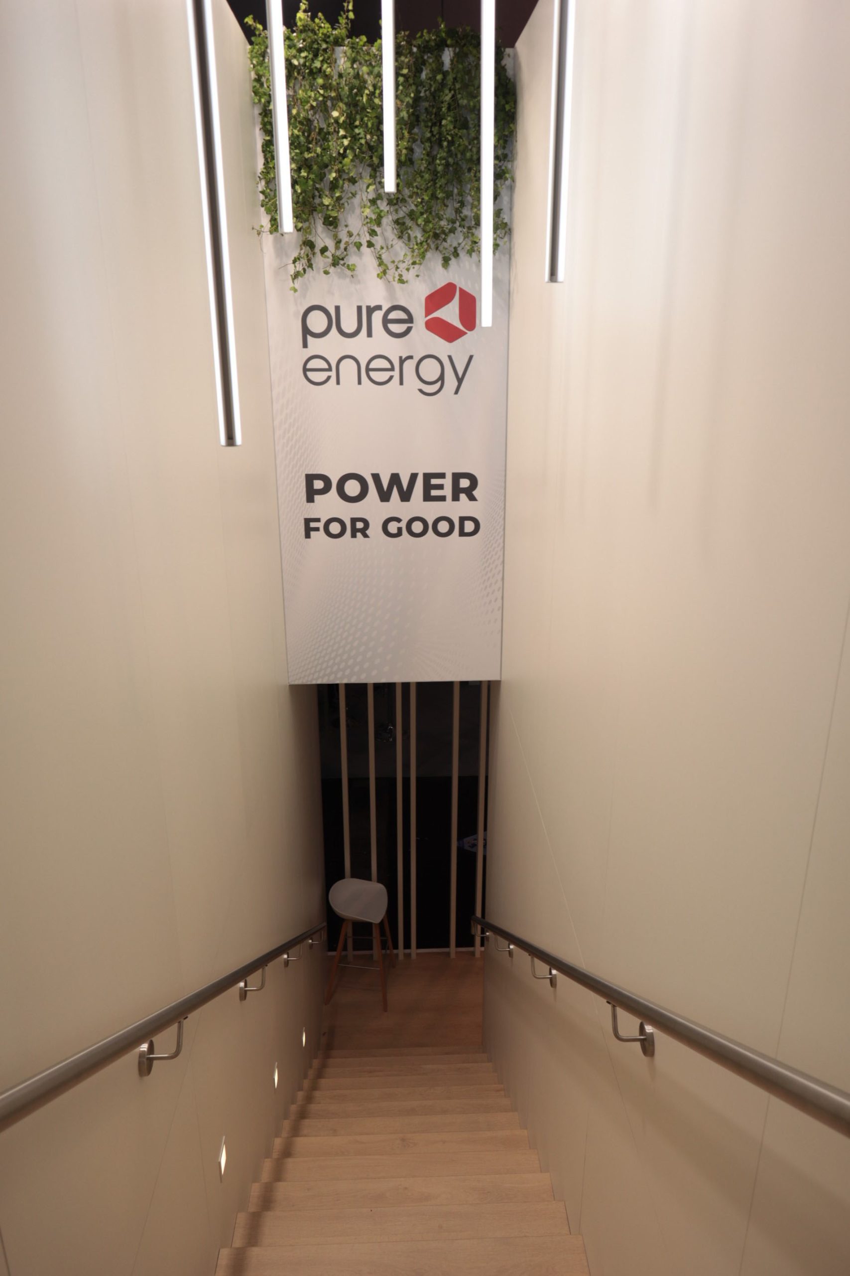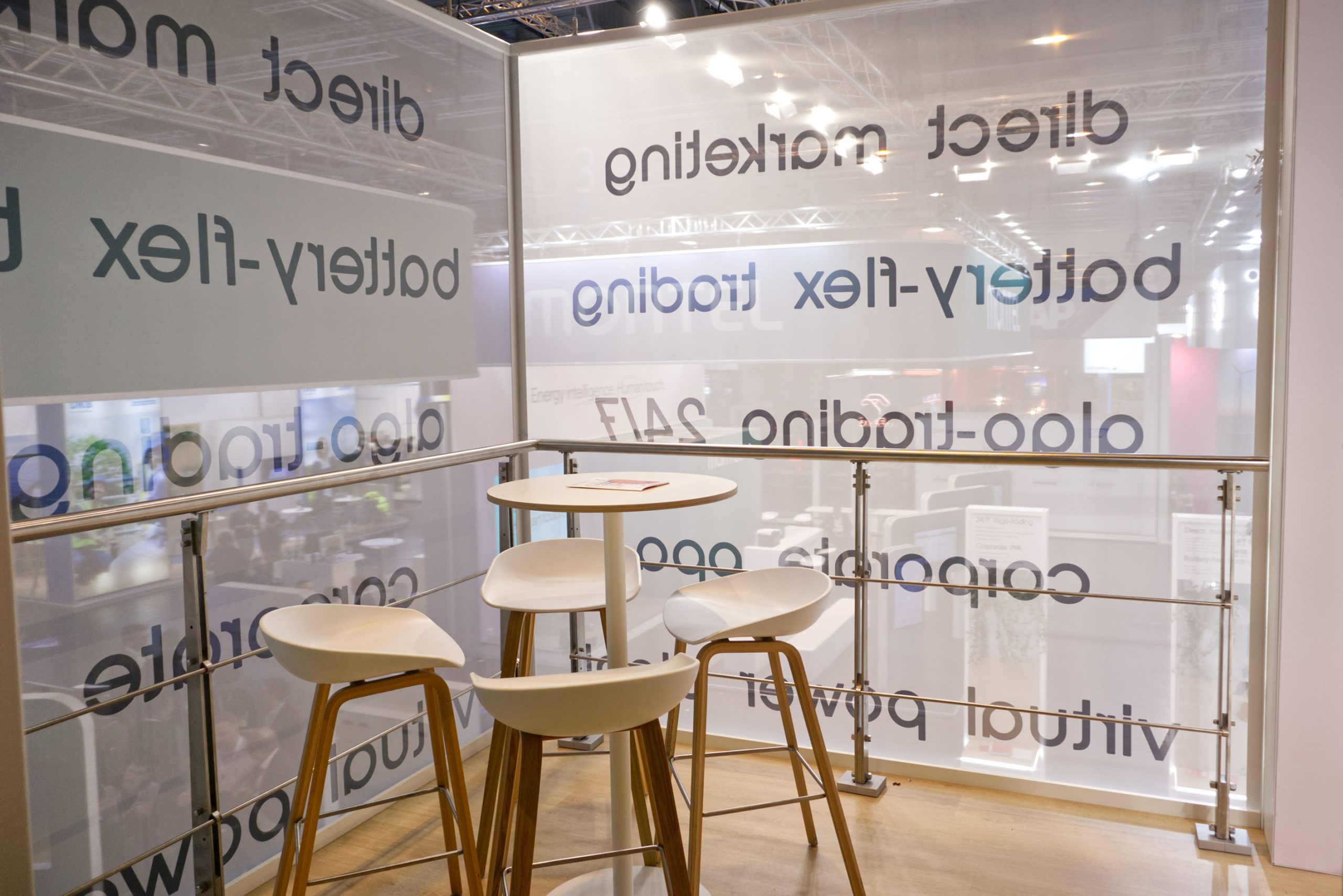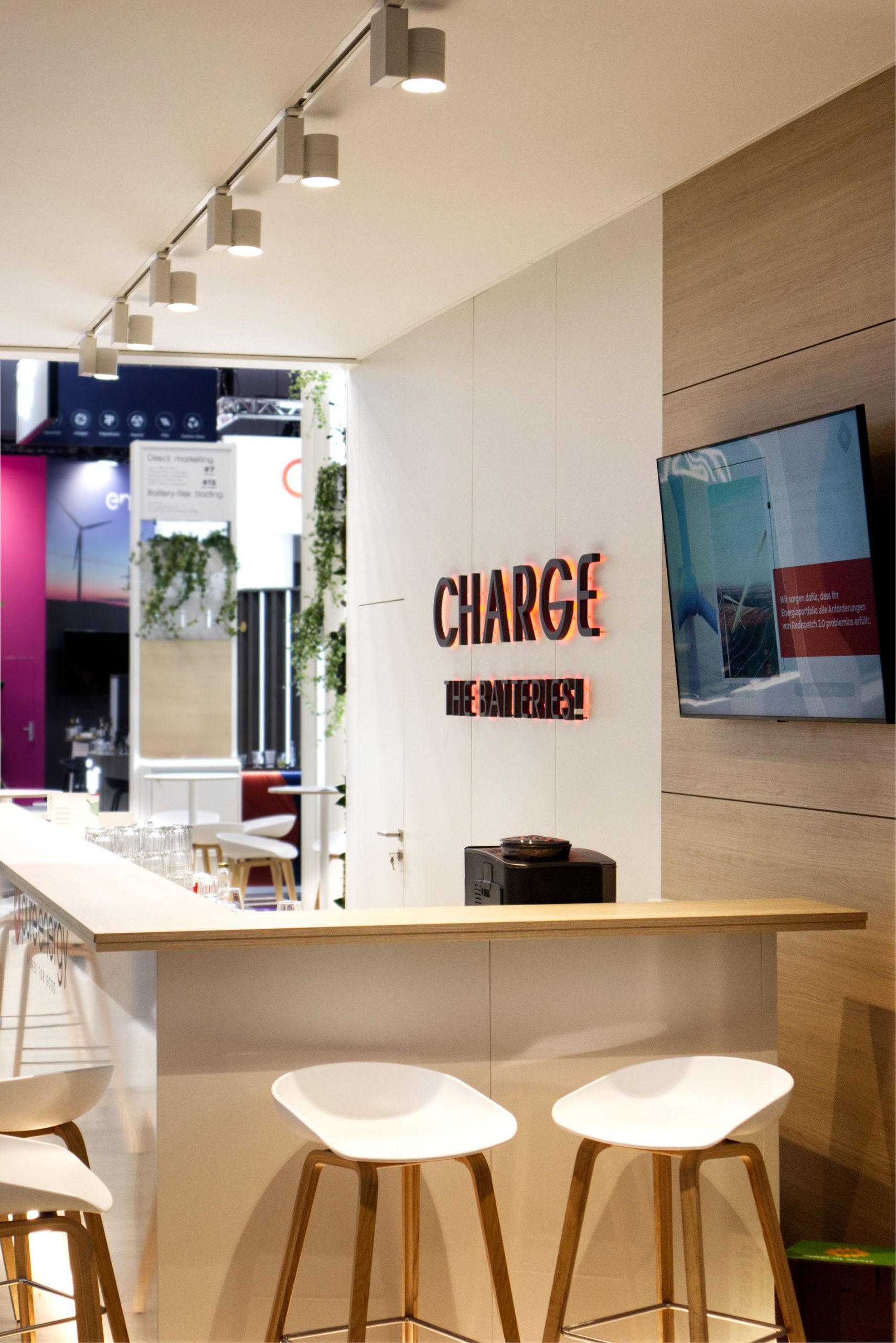 Geschützte Besprechungsräume im Obergeschoss schaffen Ruhe für konzentrierten Austausch, während unten eine einladende Bar und eine offene Get-Together Area Begegnungen fördern. Natürliche Pflanzenelemente im weißen Hochglanz-Stand setzen bewusst Akzente und lassen die Vision „Power for good“ lebendig werden.