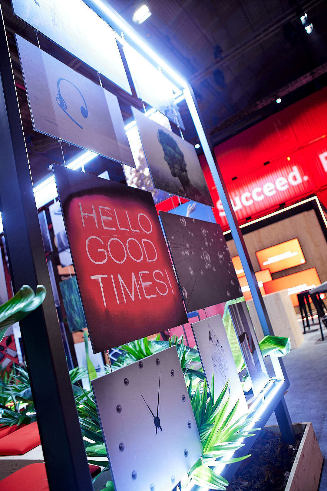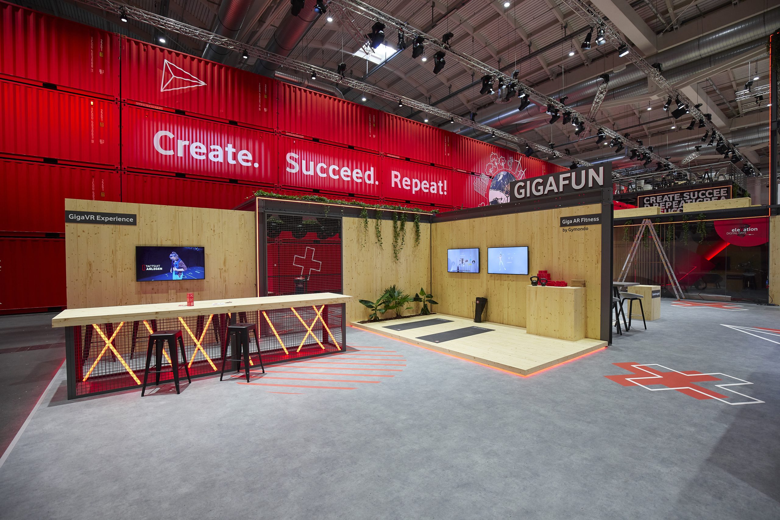 Eine imposante Landschaft aus Stahl- und Containerkonstruktionen, durchdrungen von Lichtinstallationen und interaktiven digitalen sowie analogen Touchpoints.